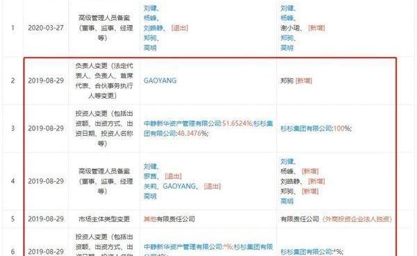 天眼查信息顯示,中靜四海股權已完成工商變更登記。2019年8月29日,中靜四海實業投資人出現變更,變更后由杉杉集團100%持股;同時法定代表人變更,由變更前的“GAOYANG”變更為“鄭駒”。鄭駒為杉杉系相關公司的高管和股東。