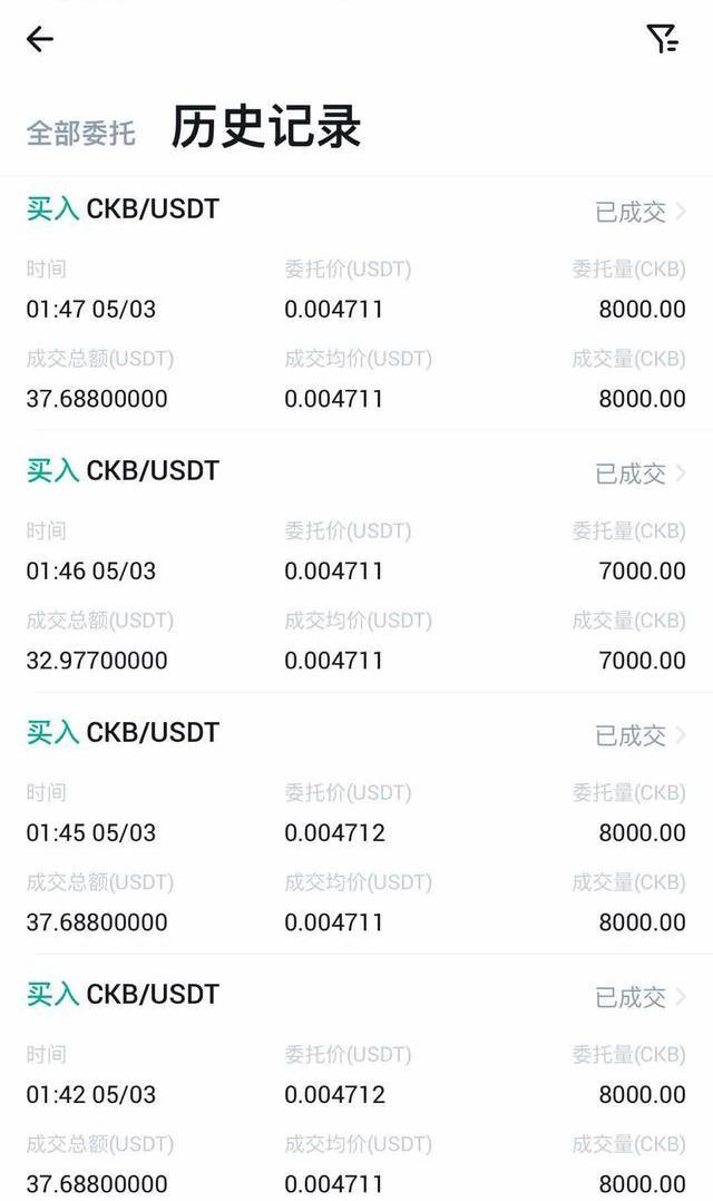 為什么這些單都是8000呢?如果一段時間內沒有交易,說明多空雙方價格沒談攏,為了促進交易,火幣里會有一個小機器人,小額掛單逐漸降低買賣雙方的價格差,使得交易更加有可能達成。我這些8000CKB的單子,都是來自小機器人的掛單,因為每次它出來在賣一上面的數量都一樣,我記得當時是8125,我留了點零頭。之后我就以0.004705、0.004605、0.004505、0.004505、0.004205、0.004105、0.004005、0.003905這樣掛單,等成交。