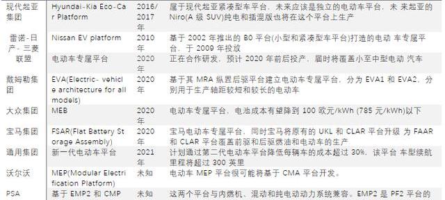 過去幾年中,傳統國際大廠的電動化進程顯得較為緩慢,在路徑選擇上也傾向于循序漸進——混動、插電混動、純電動,且依賴現有內燃機平臺改裝電動化。然而這一情況可能在未來數年內發生重大改變,根據各家車廠披露的時間表,在今后兩年內幾乎主要的汽車廠/集團將發布各自的電動車平臺,對新興的純電動企業提出挑戰。