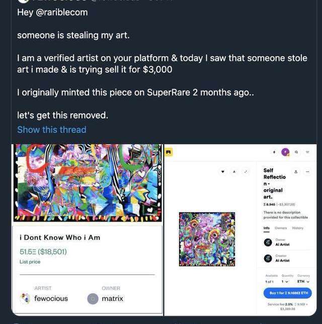 比如,就有創作者向Rarible平臺舉報,自己在SuperRare上幾個月前鑄造的作品被人重新發布到了Rarible上,并標價3000美金出售。該舉報經過查證,已被平臺接受,目前這幅作品也已經被移除。