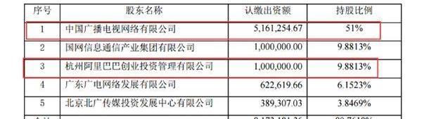 據悉,中國廣播電視網絡有限公司即中國廣電是第一大大股東,持股51%。杭州阿里巴巴創業投資管理有限公司認繳出資額為100億元,持股比例9.88%。國網信息通信產業集團有限公司持股9.8813%。后兩者認繳出資額和持股比例相同,同時并列為中國廣電的第二大股東。