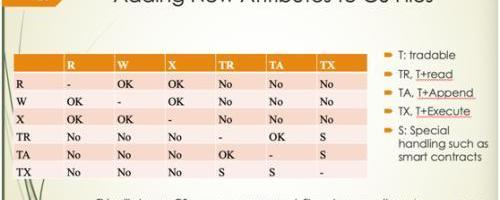一個文件除了傳統讀、寫、執行屬性外,還有T屬性,就是交易屬性。表示這數據可以參與交易。一個數據有T屬性后,還有TRT讀屬性,TA就是T添加屬性;還有TXT執行屬性,多了三種不同屬性,這三種不同屬性表示有一組數據是跟金融相關,既然是跟金融有關系,就需要監管。但是由于區塊鏈的關系,可以T讀、T添加、T執行,但是不能有TW屬性,因為數據只能加而不能改。