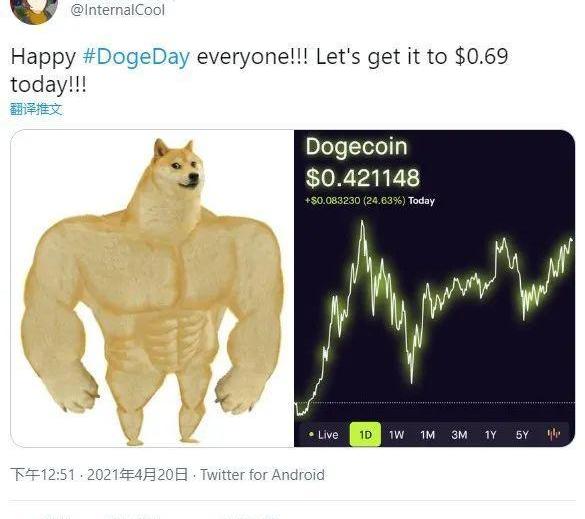 與此同時,“DogeDay”成為了當天網絡大熱詞匯,推特上帶#Doge的標簽就有18.1萬條推文,榮登當日榜首。有人甚至在推特上敦促狗狗幣粉絲們加大力度購買,力爭將其價格提高到每枚1美元。