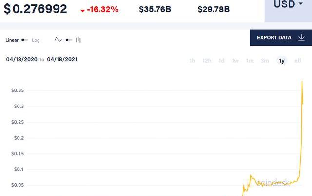 4月16日,炒作狗狗幣的瘋狂達到高潮。這一天,狗狗幣24小時內漲幅一度達250%,最高觸及0.47美元/枚,總市值一度突破600億美元。