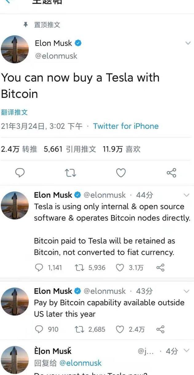 3月24日,馬斯克在推特上發文表示可以用比特幣購買特斯拉汽車。他強調,買家支付給特斯拉的比特幣將保留為比特幣,不會被轉成法定貨幣,而這兩件看似毫無關系的事情,其實是馬斯克為特斯拉的未來布下的一盤大棋?