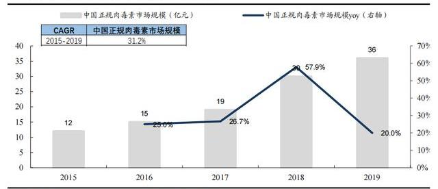縱觀整個行業,仍將保持穩定增長的勢頭。據Frost的預測,過去四年肉素市場的增速超過31%,至2019年正規肉素市場已經超過36億元。市場預計,未來五年這一賽道仍將保持17.5%的高復合增長率。