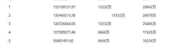 隨區塊逐步遞減6年減半的函數模型,計算得出首年區塊獎勵為15510萬枚,前6年的區塊獎勵詳見下表所示。