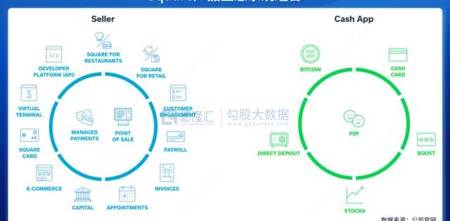 SQ是北美第二大移動支付公司,兼具B端和C端業務,主要產品分別為Seller生態系統和CashApp生態系統,seller生態系統類似于Shopify提供給商戶的SaaS服務,Cashapp類似于支付寶和PayPal。