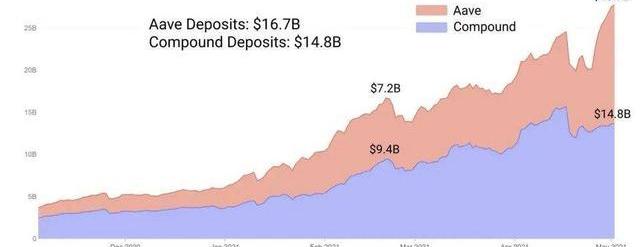 Aave和Compound是DeFi最大的借貸協議。直到最近,就存款總額而言,Compound一直是最大的借貸協議。而Aave通過其新的流動性激勵措施扭轉了這一局面,目前其在借貸中占據了流動性的主導地位。