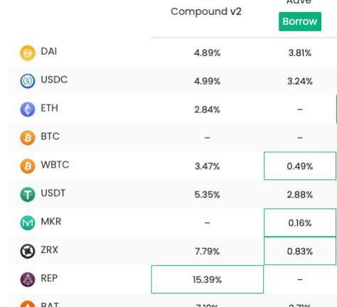 當然,對于借貸協議來說,最重要的一點就是Borrowinginterestrate和Lendinginterestrate,這兩個利率直接和借貸雙方的利益相關。所以,我們需要看一下Aave和Compound的利率,看看是否有很大差別,defirate顯示二者主流借貸幣種30日平均數據如下: