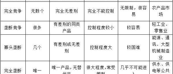 基礎理論:根據市場上競爭和壟斷的關系,市場類型可以分為:完全競爭市場、壟斷競爭市場、寡頭壟斷市場及完全壟斷市場。可以從產商數目、產品差異程度、價格控制程度、進出市場的難易程度上區別,如下表所示: