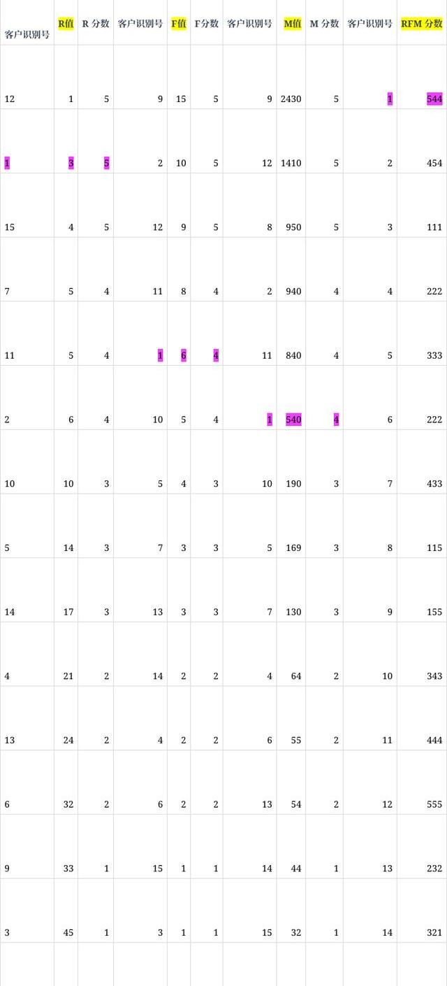 對每個客戶的R、F、M值打分,然后得到綜合評分,最高555分,最低111分,總共可以得到125個客戶分組。