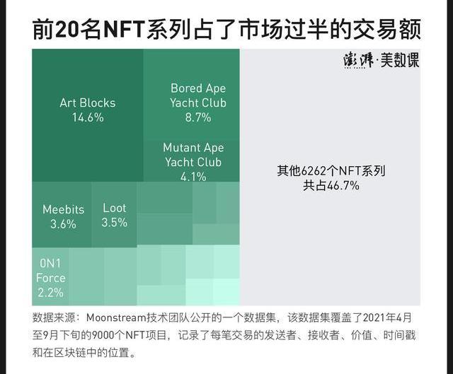 數據分析發現,若以交易額來排序,前20名的NFT系列的交易額,占了市場交易總額的53%,但以數量而言,它們只占所有共計6283個系列的0.3%。