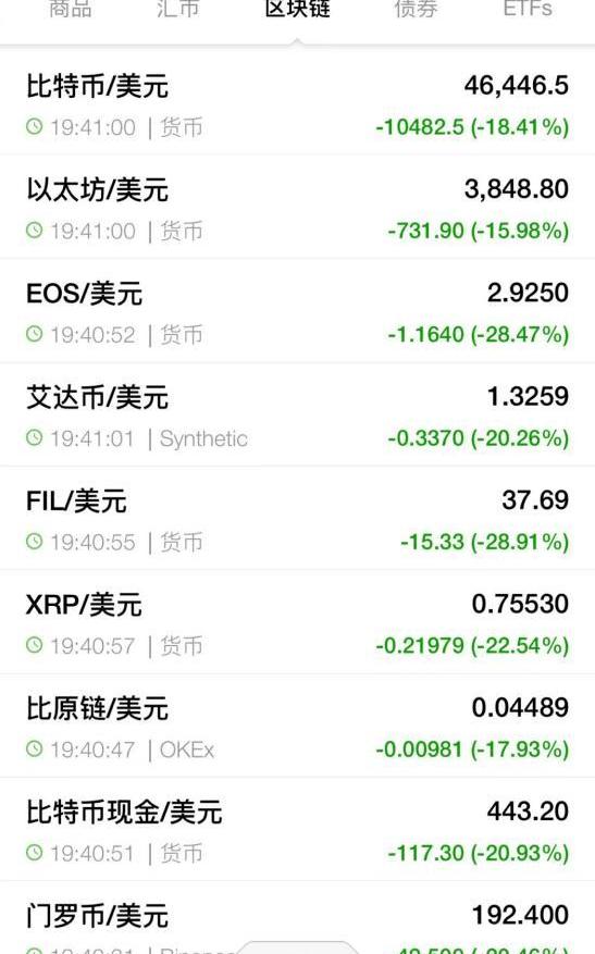 截至12月4日晚7時40分左右,比特幣報價約46500美元/枚,24小時下跌超18%;以太坊報約3850美元/枚,24小時跌幅約16%。此外,EOS幣跌逾28%、艾達幣跌逾22%、門羅幣跌逾20%、狗狗幣跌逾22%、幣安幣跌近13%。