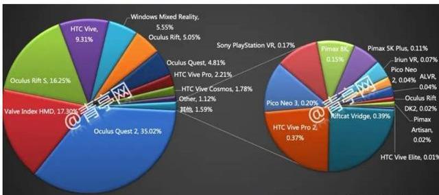 Steam平臺的月連接VR設備數量繼續上升,Oculus繼續遙遙領先。2021年10月SteamVR活躍玩家占Steam總玩家數量的1.85%,環比上漲0.05%。Steam上市占率前四大的品牌分別是:Oculus、Valve、HTC、微軟WMR系列。其中最便攜的性價比之王Quest2在10月的份額達到了35.02%。