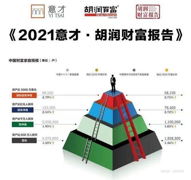 報告指出,截至2021年,中國擁有600萬人民幣總財富的“富裕家庭”數量已經達到508萬戶,比上年增加7萬戶,增長率為1.3%,其中擁有600萬人民幣可投資資產的“富裕家庭”數量達到183萬戶;擁有千萬人民幣總財富的“高凈值家庭”數量達到206萬戶,比上年增加4萬戶,增長率為2%,其中擁有千萬人民幣可投資資產的“高凈值家庭”數量達到110萬戶;擁有億元人民幣總財富的“超高凈值家庭”數量達到13.3萬戶,比上年增加3,300戶,增長率為2.5%,其中擁有億元人民幣可投資資產的“超高凈值家庭”數量達到7.9萬戶;擁有3000萬美元總財富的“國際超高凈值家庭”數量達到8.9萬戶,比上年增加2,400戶,增長率為2.8%,其中擁有3000萬美元可投資資產的“國際超高凈值家庭”數量達到5.6萬戶。