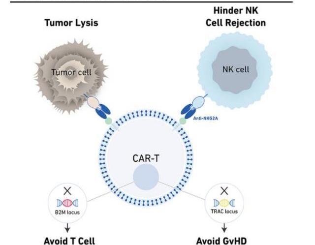 自體CAR-T細胞療法的制備時間長,價格昂貴,對患者的T細胞狀態有需求這些原因削弱了CAR-T療法的可及性。同種異體CAR-T通常從健康人群或通過干細胞誘導等方式獲得外源性T細胞,將CAR基因通過載體導入T細胞中,制備同種異體CART。這種通用型產品能夠規模生產從而降低治療費用,類似現貨型藥物可靈活取用,大大提高患者的可及性。然而同種異體CAR-T也存在一些局限性,例如可能會受到移植物抗宿主病和宿主抗移植物反應的限制,使異體CAR-T細胞無法在體內存活、增殖和持續發揮療效,帶來了重大的安全挑戰。