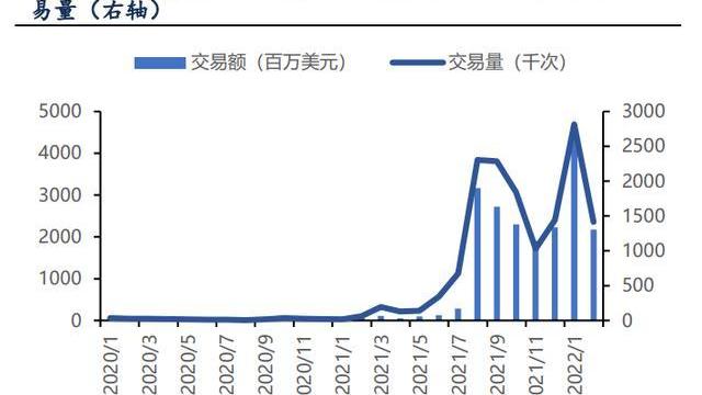 2022年1月海外NFT市場快速增長,Opensea平臺月度交易額、月度交易量和月度日活交易用戶均創歷史新高。根據Dappradar,2022年1月,Opensea的交易額提升至44.91億美元,環比增長102%,交易量增加至281.63萬次,環比增長95%,日活交易用戶4.68萬人,環比增長86%。