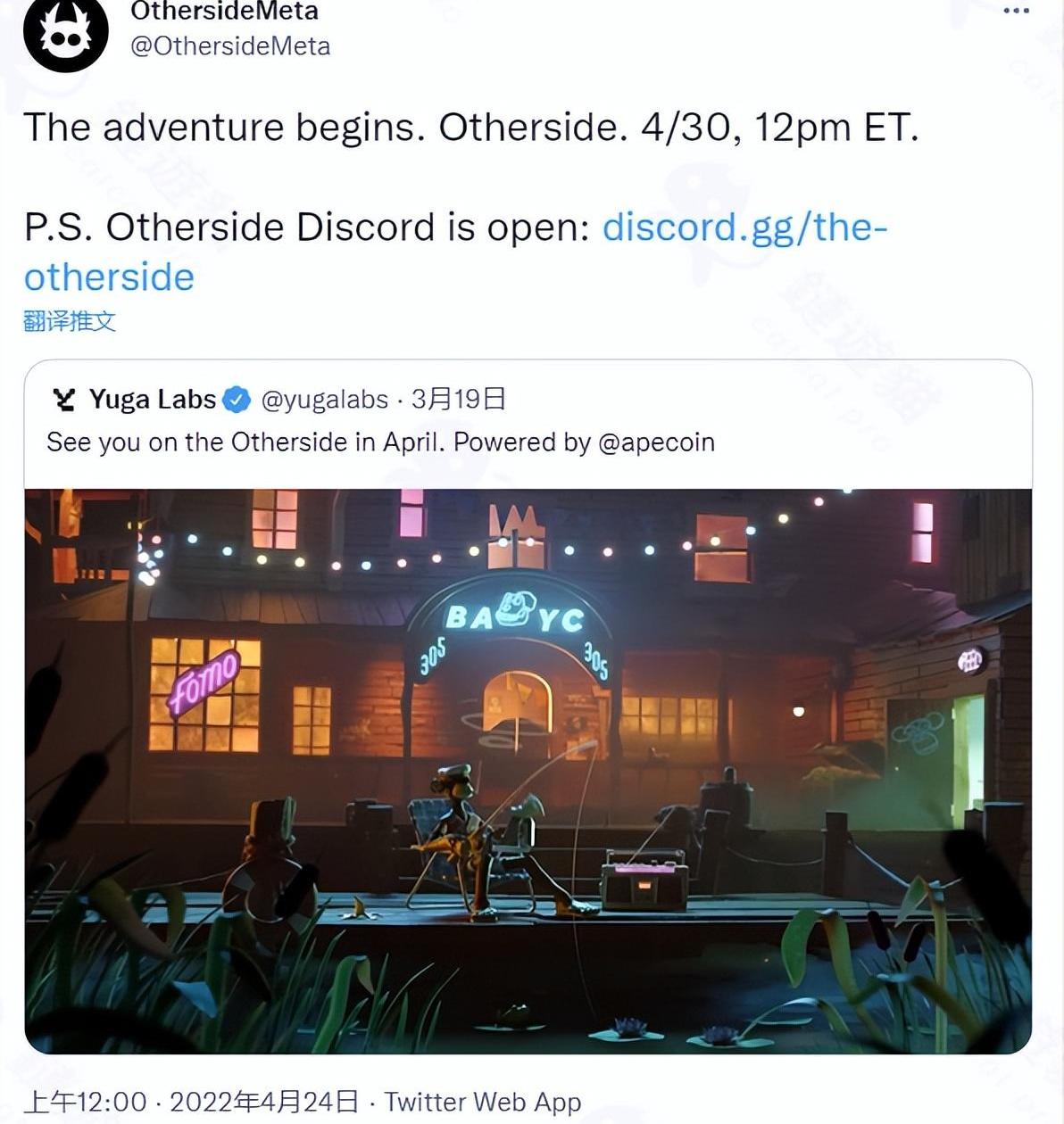 BAYC元宇宙項目Otherside今日宣佈將于美東時間4月30日12:00p.m.“開啟冒險之旅”,根據無聊猿持有者@Renegademaster此前說法,應為土地NFT售賣。