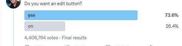 就在被曝出躋身第一大股東的次日,馬斯克在Twitter上發起投票:“你們想要編輯按鈕嗎?”這條推文獲得5.6萬次轉發,約441萬投票者中的73.6%表示支持。Twitter隨后表示,將在未來幾個月內啟動編輯功能的內測。