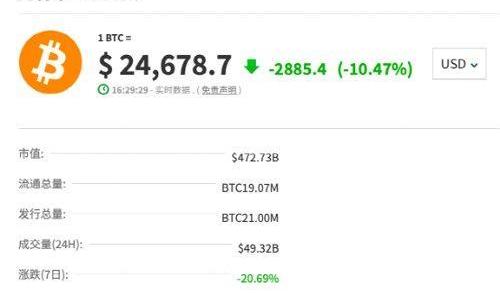 6月13日,比特幣大幅殺跌至25000美元/枚,并在該點位來回絞殺后,又再度下探至24000美元一線,截至發稿,比特幣24小時跌幅已達到10.47%,報24678.7美元/枚,創下2020年12月以來的最低點。