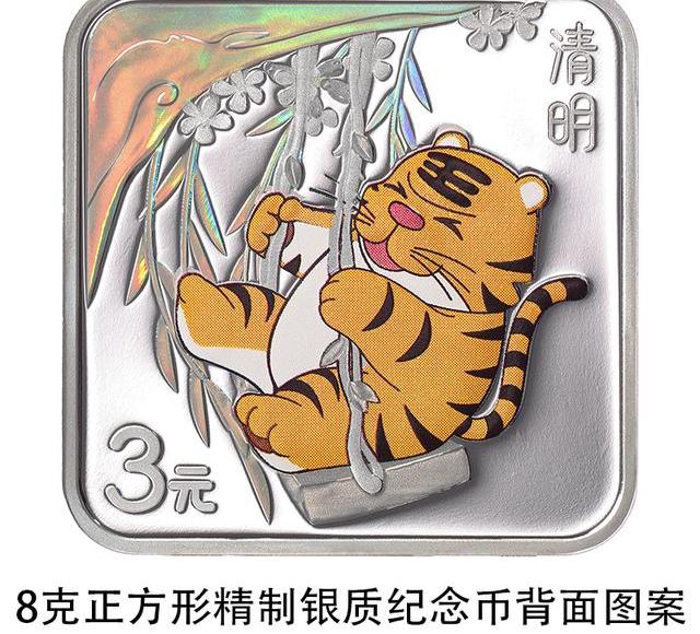 8克正方形銀質紀念幣背面圖案以虎、柳枝、秋千為主要設計元素,展現清明時節“蕩秋千”習俗,并刊“清明”字樣及面額。