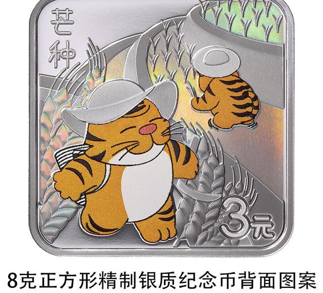 8克正方形銀質紀念幣背面圖案以虎、小麥、稻苗為主要設計元素,展現芒種時節搶收搶種農忙景象,并刊“芒種”字樣及面額。