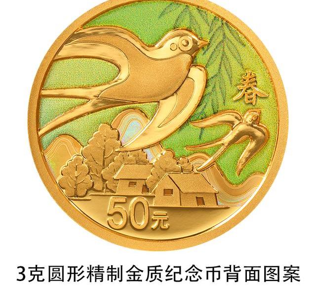 3克圓形金質紀念幣背面圖案為裝飾燕子造型,襯以柳枝、民居、樹木、山巒等組合設計,并刊“春”字樣及面額。
