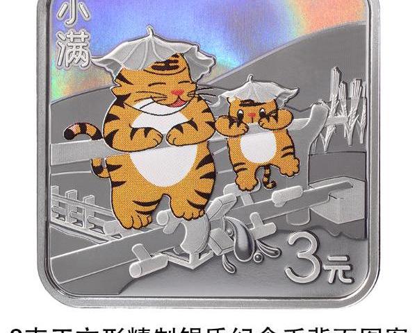8克正方形銀質紀念幣背面圖案以虎、水車、小麥為主要設計元素,展現小滿時節物候、農事景象,并刊“小滿”字樣及面額。