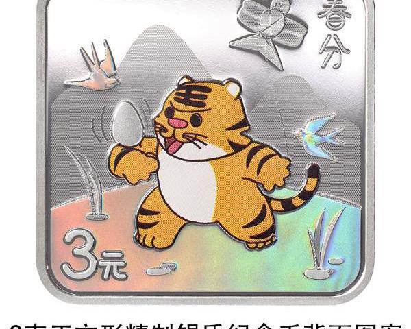 8克正方形銀質紀念幣背面圖案以虎、蛋、風箏、燕子為主要設計元素,展現春分時節“放風箏”“豎蛋”習俗,并刊“春分”字樣及面額。