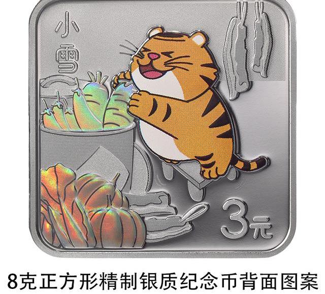 8克正方形銀質紀念幣背面圖案以虎、蔬菜、臘肉為主要設計元素,展現小雪時節“腌菜”“制臘肉”習俗,并刊“小雪”字樣及面額。