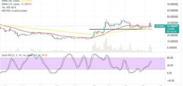 以太坊經典價格統計:ETC價格現在-$34.90ETC市值-48億ETC循環供應-1.368億ETC總供應量-2.107億Coinmarketcap排名-#19ETC/USD市場關鍵水平:阻力位:$50,$60,$70支撐水平:$30,$25,$20ETC/USD-每日圖表日線圖顯示以太坊經典市場操作范圍在由繪制的水平線標記的高點。14日均線指標在34.39美元高于50日SMA指標的30.21美元價值線。較大的交易SMA和水平線位于同一條線上,以確認基點的有效性。隨機振蕩器相對向北轉向,出現在59.53和64.14的范圍值。