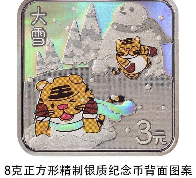 8克正方形銀質紀念幣背面圖案以虎、雪人、松樹為主要設計元素,展現大雪時節“至此而雪盛也”景象、打雪仗嬉戲場景,并刊“大雪”字樣及面額。