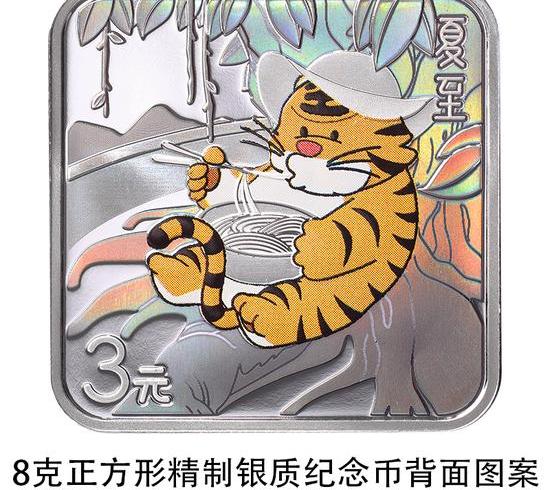 8克正方形銀質紀念幣背面圖案以虎、榕樹、面條為主要設計元素,展現夏至時節“夏至吃面”習俗,并刊“夏至”字樣及面額。
