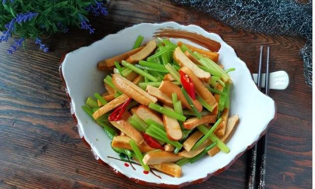 2、接著鍋留底,放蔥姜蒜炒香后,把芹菜下鍋,翻炒一分鐘,然后把豆干下鍋,放少許的生抽,再放少許的鹽,淋點香油,翻炒均勻就可以出鍋吃啦,口感脆嫩防秋燥,別不知道吃。