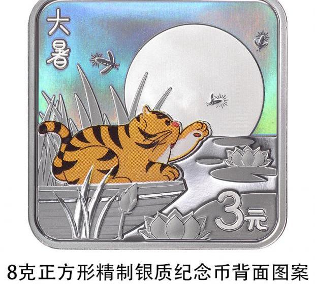 8克正方形銀質紀念幣背面圖案以虎、小船、池塘、螢火蟲為主要設計元素,展現大暑時節“腐草為螢”物候現象,并刊“大暑”字樣及面額。