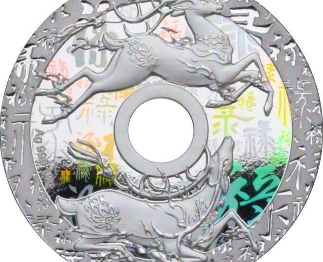 幣面主圖為兩頭充滿靈氣的麋鹿,背景為各種字體的“祿”字,“鹿”與“祿”諧音,寓意高官厚祿,步步高升。