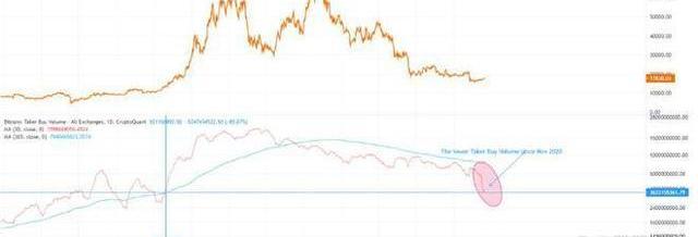 盡管拋售壓力可能已經下降并且鯨魚增持加劇,但比特幣的買入量最近創下2020年11月以來的最低水平。比特幣買入量勢頭的增長通常先于其價格的最終上升趨勢。然而,根據CryptoQuant分析師的說法,Ghoddusifar比特幣的“購買量仍在下降,并已達到2020年11月以來的最低水平”。