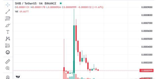 SHIB/USDT的月度圖表顯示,meme代幣的價格走勢在過去4個月內開始活躍起來,在此期間,meme代幣能夠達到0.00002000美元的高位,然后才回落。