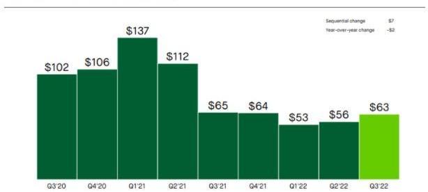 在第三季度財報中,Robinhood凈累計資金賬戶穩定在2,290萬,但這不是正確的指標,因為該公司的收入主要來自手續費。相反,投資者應該關注月活躍用戶(MAU),因為Robinhood從活躍投資者那里獲利最多,如圖2可見,該公司的MAU連續第5個季度下降。