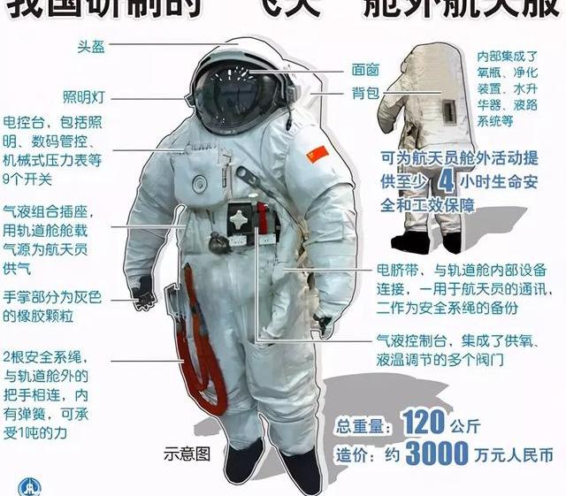 既然是出艙活動,就離不開艙外航天服,陳冬和蔡旭哲身穿的艙外航天服是我國自主研制的“飛天”艙外航天服,目前是第二代“飛天”航天服,造價相當高,我沒有找到第二代飛天艙外航天服的造價,但是第一代飛天艙外航天服造價就高達3000萬人民幣,而第二代飛天艙外航天服無論是使用次數、使用時間,還是安全性,精細度等都比第一代進步了不少,造價肯定不會很便宜。