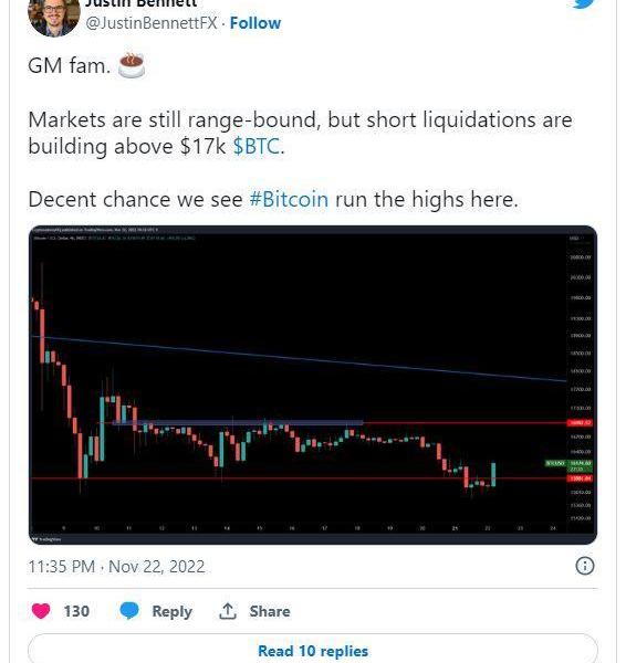 賈斯汀·貝內特(JustinBennett)表示,“市場仍在區間波動,但空頭清算正在超過17,000美元。”交易員說,“我們看到在這里創下高點的可能性很大。”