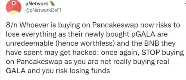 盡管如此,對于那些后來購買代幣的投資者,社區將支付他們購買代幣所花費的BNB。在帖子的最后,pNetwork再次警告投資者:“再一次,不要在Pancakeswap或任何其他BSCDEX上購買pGALA”