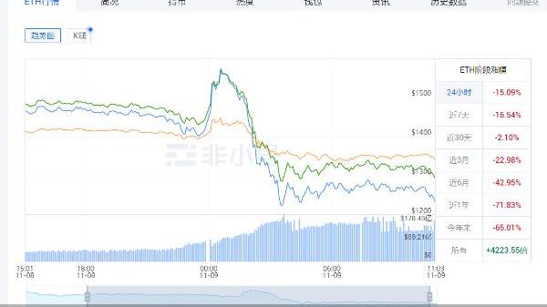 暴跌模式下,同為幣圈主流幣的以太坊下挫更狠,從11月9日凌晨0點左右同樣開啟劇烈下跌,從1574美元一路跌破1500美元、1400美元、1300美元,最低下探至1288美元,截至11月9日11時30分,以太坊最新價格報1301美元,日內跌幅15.09%。
