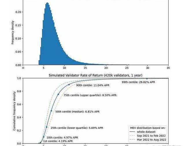 基于合并后向驗證者支付相同水平MEV的模型表明,驗證者的中位回報率為6.1%APR,下四分位數為5.3%,上四分位數為7.3%。這是基于過去6個月的數據。