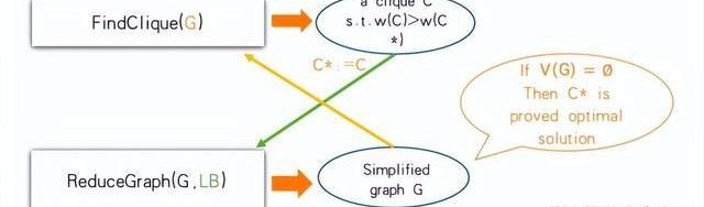 按照該框架來做這個事情,我們需要兩個子算法,一個做啟發式求解,在團里稱為FindClique,另外一個是化簡算法,稱為ReduceGraph。我們可以用FindClique找到一個團,這個團會比之前找到的要好。當這個更好的團走到ReduceGraph,我們知道的是:最大團至少有這么大。也是在這一步做化簡,如果圖經過化簡變為空,那么說明找到的團就是最優解;如果沒有變為空,那么可以減少一些點,再回去調整找團的算法。這里的算法不一定是固定的算法,可以動態地變化。