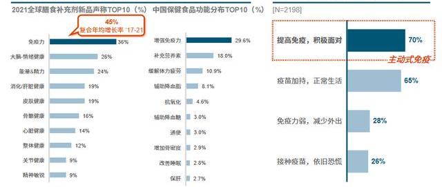 自新冠疫情爆發已經過去了三年,國內已放開疫情管控,部分地區隨之發生醫療資源擠兌,在此背景下如何提升自身免疫力成為大多數人最關心的健康話題之一,相關產品討論熱度只增不減,2017年到2021年間全球市場免疫力相關產品復合年均增長率為45%,國內的保健食品中29.6%的產品功能為增強免疫力,在所有功能中占比位列首位。