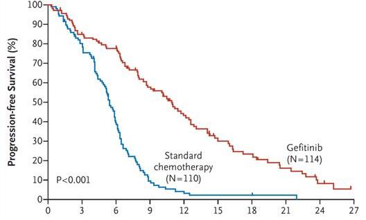 最早出現的靶向治療藥物,它的上市過程頗有一番曲折。1998年,一期臨床試驗發現部分化療后進展NSCLC患者對易瑞沙反應非常迅速,腫瘤明顯縮小。2002年阿斯利康將易瑞沙率先在日本上市,2003年FDA批準在美國上市。然而,在III期的ISEL臨床試驗中,在1692名患者中,吉非替尼并沒有較安慰劑表現出明顯的優勢。2005年FDA不允許吉非替尼在新患者中使用,基本上宣告了吉非替尼在美國市場的結束。同年阿斯利康也撤回了吉非替尼在歐洲的上市申請。2011年阿斯利康主動宣布在美國市場將吉非替尼撤市。