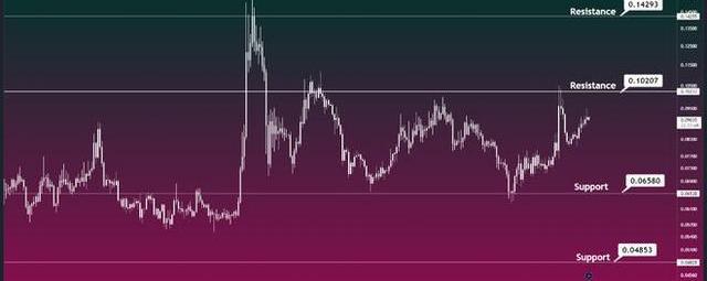 從上圖中,我們可以分析并確定以下是狗狗幣(DOGE)2023年的阻力位和支撐位。