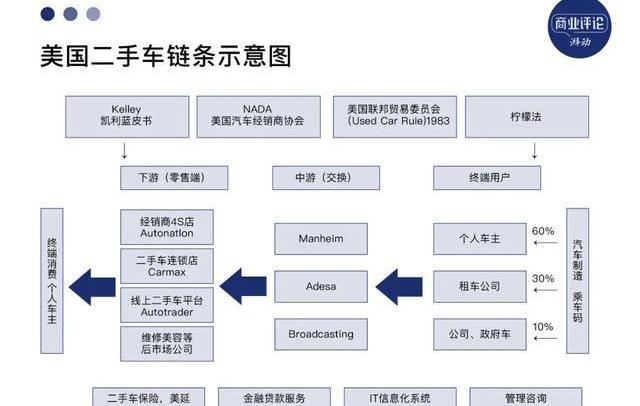 美國二手車市場的經營渠道中,授權汽車經銷商4S店占據了37%的市場份額,二手車連鎖店份額為34%,剩下的則是個人及其他交易。到目前為止,美國已形成相對完善的二手車交易鏈條。上游主要是批量車源,中間有拍賣公司,下游是不同模式零售商。圍繞交易鏈條有報價的藍皮書,金融公司(Dealertrack)等。